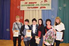25 января – один из самых любимых студентами праздников – «Татьянин день». Ежегодно в нашем техникуме по случаю Всероссийского студенческого дня директор Е.Е. Барсукова устраивает Торжественный приём отличников учёбы. 65 студентов были награждены грамотами и памятными призами за особые успехи и достижения в теоретической и профессиональной подготовке. Особое внимание было уделено Директорским стипендиатам: Алёне Фоменко (5курс), Сергею Яциняк (4курс), Татьяне Ладониной (3курс), Илье Обухову (2курс). Им, а также Алексею Редькину (2курс) и Дмитрию Валько (3курс) была объявлена благодарность главы администрации города Амурска Б.П. Редькина. Виват! Татьянин День!