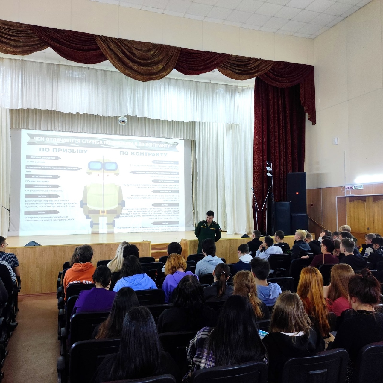 Юношам и девушкам рассказали о специфике службы по контракту в рядах Вооружённых сил Российской Федерации. Выпускники узнали о условиях проживания, возможностях служебного роста, выборе места службы и рода войск, денежном довольствии и различной материальной помощи.