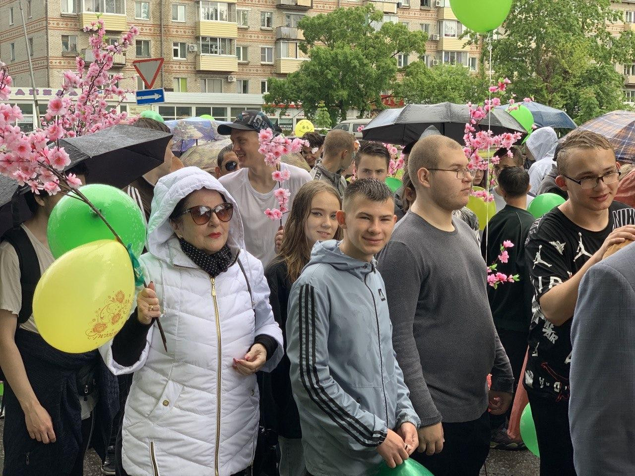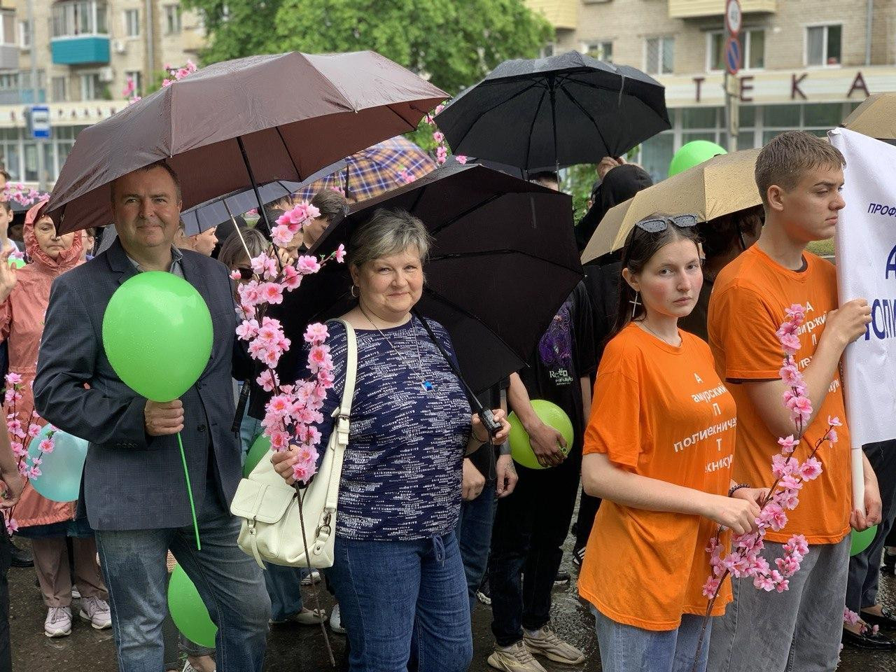Вот и этот юбилейный год не стал исключением! Радостное настроение не испортил даже неожиданно начавшийся дождь. С большим желанием в празднике приняли участие около 120 человек от нашего техникума. Весело и бодро колонны проследовали от набережной до Дворца культуры.