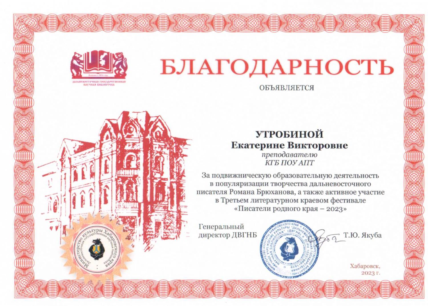 27 сентября группа 304 ПКД приняла участие в Третьем литературном краевом фестивале «Писатели родного края - 2023». Студенты с большим интересом знакомились с творчеством амурского писателя мистика и фантаста Романа Яковлевича Брюханова. Был организован открытый микрофон между автором и гостями. В конце встречи студенты смогли получить автограф от молодого писателя и его первый сборник рассказов «Светлая сторона тьмы».