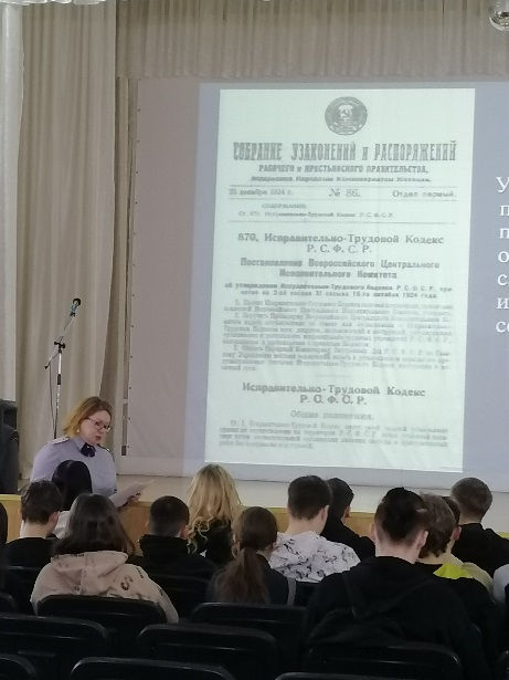 В группах 114, 102 перед студентами выступила начальник филиала УИИ по Амурскому району Лисенкова Елена Николаевна, которая рассказала о видах наказаний без изоляции от общества. Так же Елена Николаевна рассказала об уголовном кодексе России, как он изменялся и дополнялся, что поменялось на данный момент, что такое профилактика и правонарушения, какие бывают виды уголовных наказаний и виды наказаний для несовершеннолетних. Студенты задали вопрос о наказаниях за буллинг в социальных сетях, получили исчерпывающий ответ.
