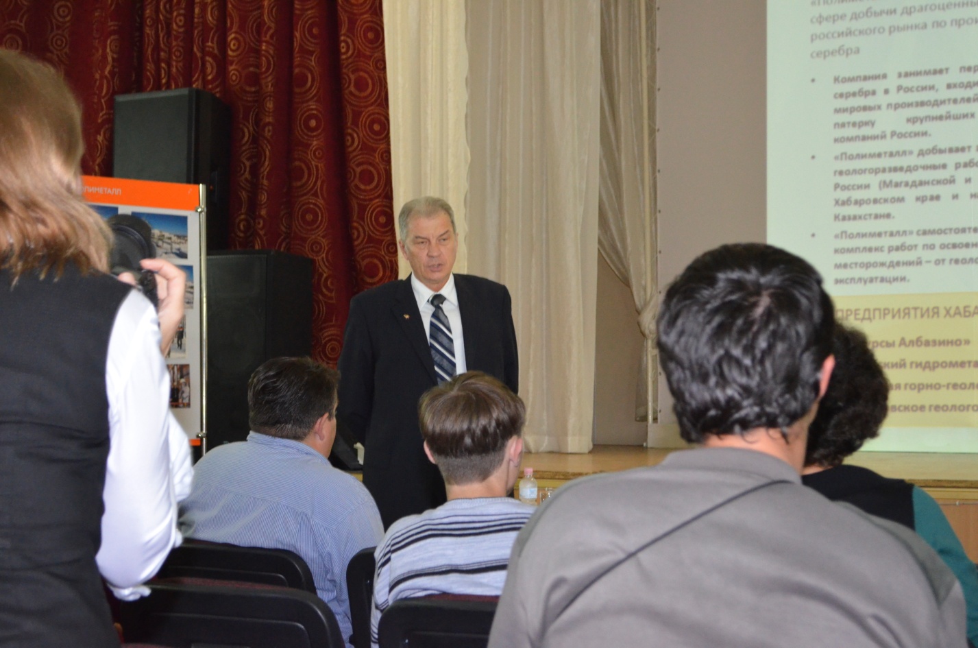 Первые лица предприятия – управляющий директор Шамин Владимир Юрьевич и начальник производственно-технического отдела ООО «Ресурсы Албазино» Сайфулин Виталий Владимирович выступили перед собравшимися в актовом зале техникума с информацией о предприятии, рассказали об особенностях производства, уникальном оборудовании и технологическом процессе обогащения руды