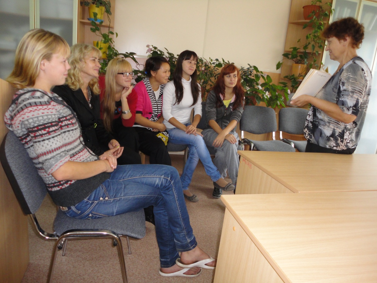 Интересная беседа и знакомство учащихся с библиотечным фондом техникума задали хороший тон для дальнейшей работы. Учащиеся ознакомились с технической стороной и возможностями получать информацию, использовать ПК. Это так необходимо при выполнении проектов и слайд – шоу. Библиотекарь техникума Тамара Николаевна Мирошникова ознакомила учащихся с новинками в литературе и объяснила схему подбора нужного материала.
