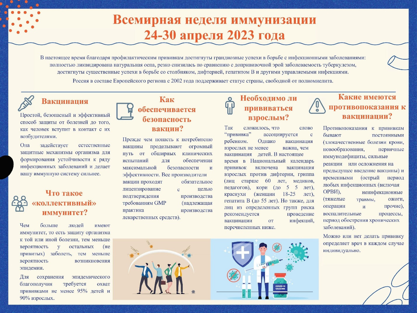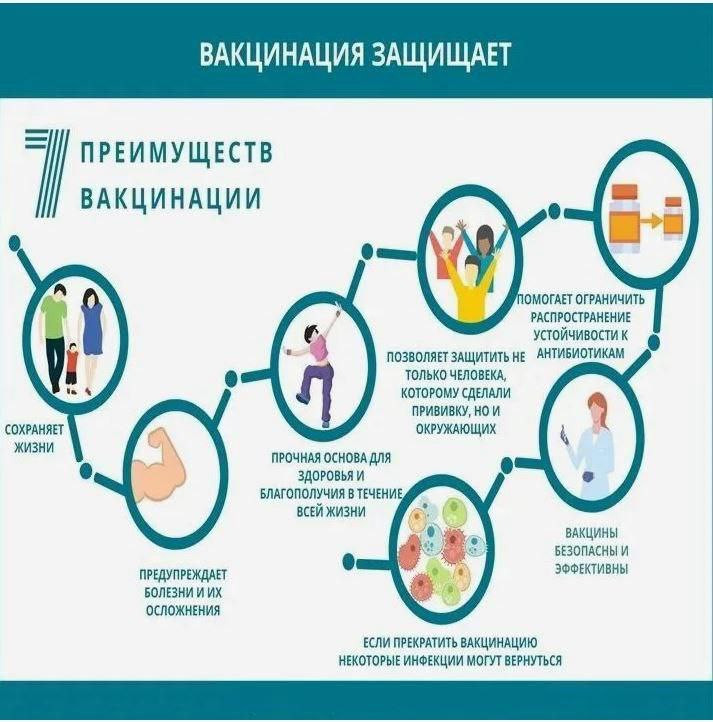 Вакцинация — это инвестиция в здоровье, безопасность и будущее. Простая прививка может спасти вам жизнь или жизнь ваших близких. Вакцины тренируют иммунную систему к выработке необходимых антител. Ключевое значение в поддержании иммунитета, так же является, ведение здорового образа жизни и своевременные медицинские осмотры. Не откладывайте здоровье на потом!