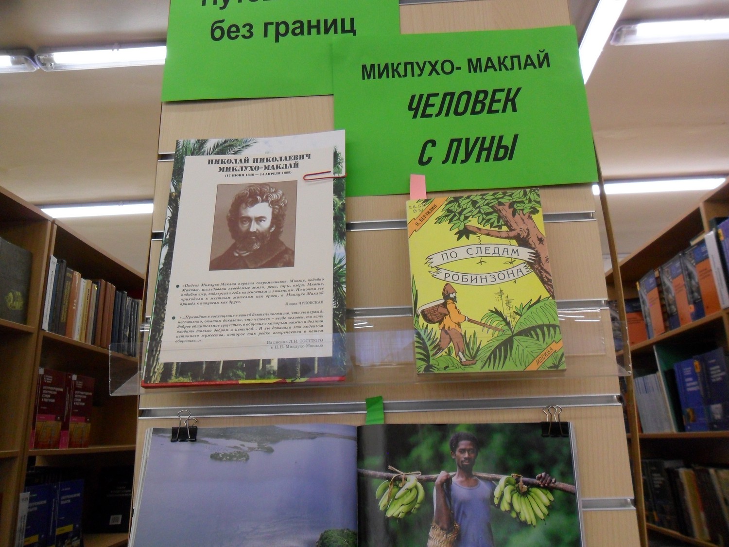Мы создали новую выставку «Путешествия без границ». Миклухо-Маклай Н.Н., — человек, которому аборигены приписывали божественную сущность, борец с работорговлей, биолог, этнограф, антрополог и патриот России. День рождения Миклухо-Маклая неофициально отмечается как профессиональный праздник этнографов. Один из отчаянных путешественников нашего времени – Федор Конюхов — первый человек, который в одиночку пересек Атлантический океан на обычной гребной лодке. Его достижения 5 раз записывались в Книгу рекордов Гиннесса. Выставки об этих датах и людях призывают молодое поколение познавать окружающий мир с целью его исследования и преобразования.