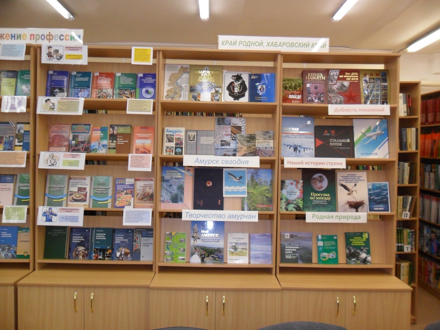 Краеведческая подборка обновлена альбомами об экономических достижениях края. Добавлены материалы о заповедных зонах и природных особенностях Приамурья. Это, как и выставка «Постижение профессии», постоянно действующие витринные выставки в читальном зале. Ко Дню студенчества, Дню защитника, Дню памяти воинов-интернационалистов – традиционные ежегодные. В 2026 исполняется 65 лет со дня первого полета человека в космос, 40-летие Чернобыльской аварии. Ей посвящена выставка «Черная быль». О катастрофе для нескольких европейских территорий, о ликвидаторах, о последствиях выброса радиоактивных веществ в атмосферу.