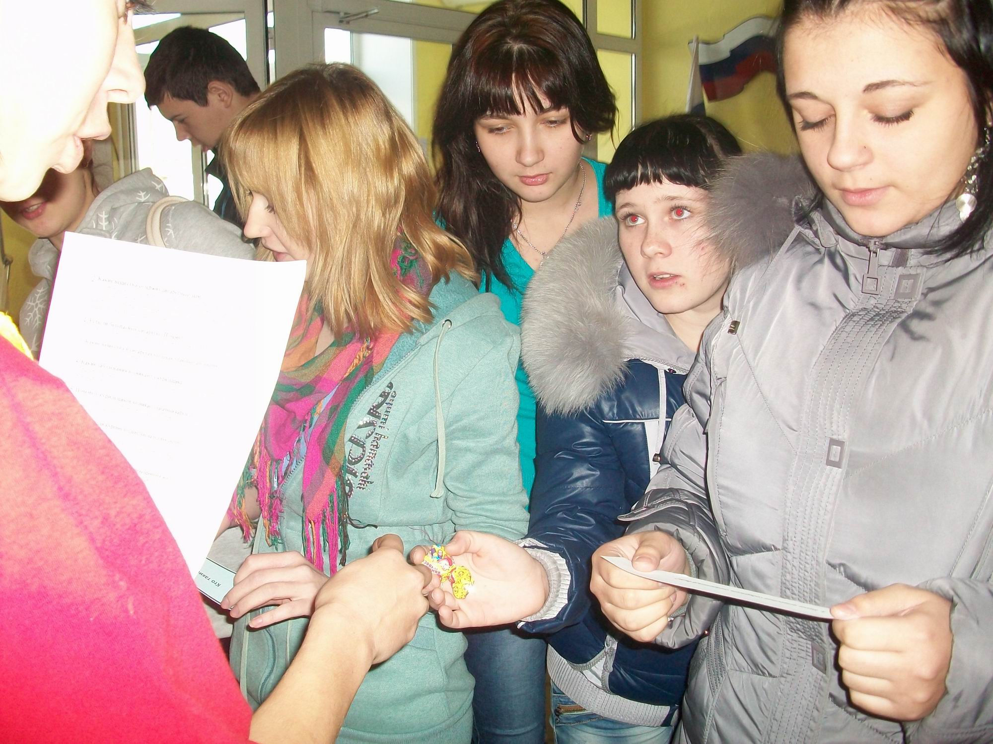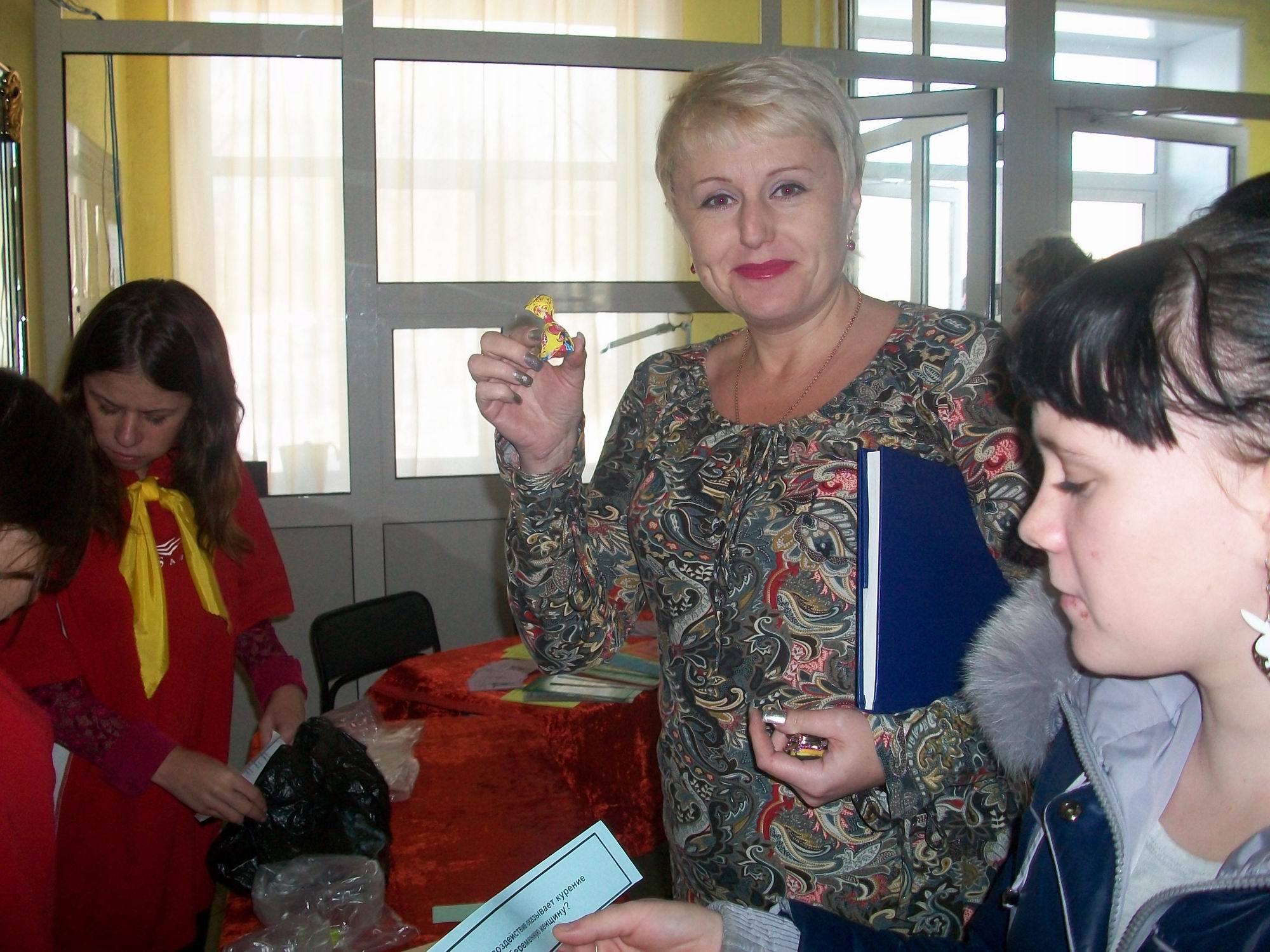 Раздаточный материал охотно прочитывался ребятами, а ручки и конфеты, которые давали за правильные ответы, разошлись очень быстро
