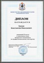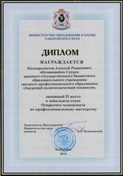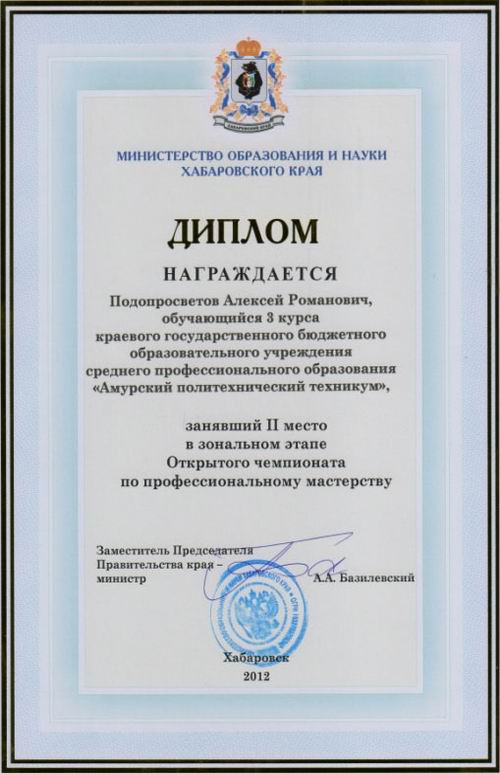 От Амурского политехнического техникума участие принимала команда в составе двух человек: Грехов Константин, наш выпускник 2010 года и Подопросветов Алексей, студент 3 курса. Костя сразу же после выпуска устроился на работу в ООО «Аркос» и сейчас уже имеет 5 разряд электромонтажника. Алексей – непременный участник и победитель конкурсов профмастерства по профессии «сварщик». Оба парня целенаправленно стоят свою карьеру, уверены в своем будущем.