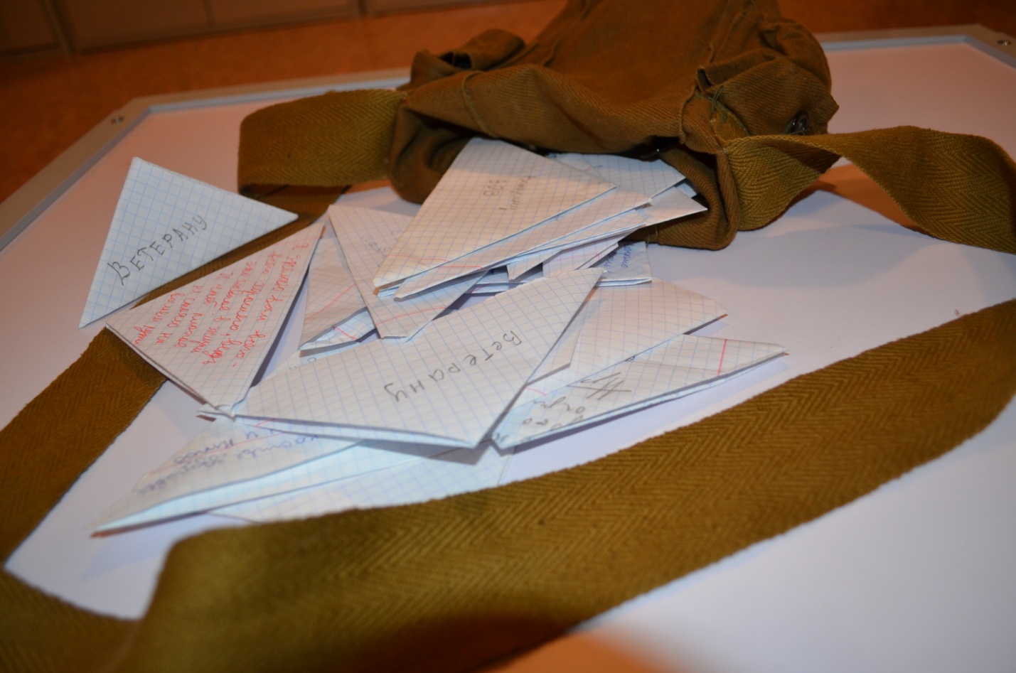 Фронтовое письмо имело необычную треугольную форму. Треугольник изготавливался из обычного тетрадного листка. Сначала загибался уголок листа справа, потом слева направо. Оставшуюся полоску бумаги вставляли внутрь треугольника.