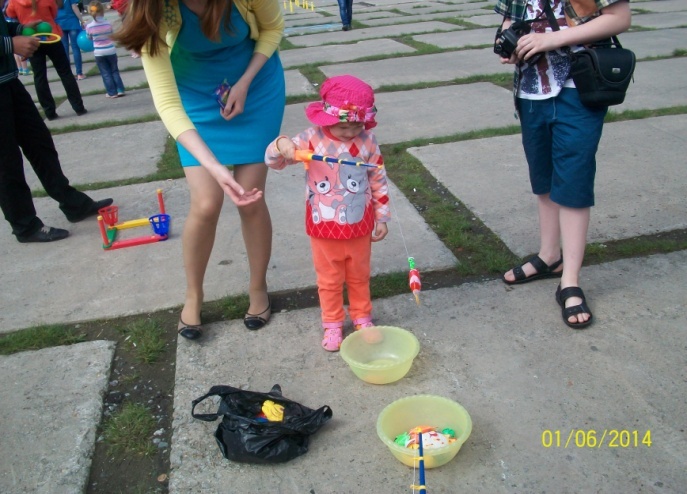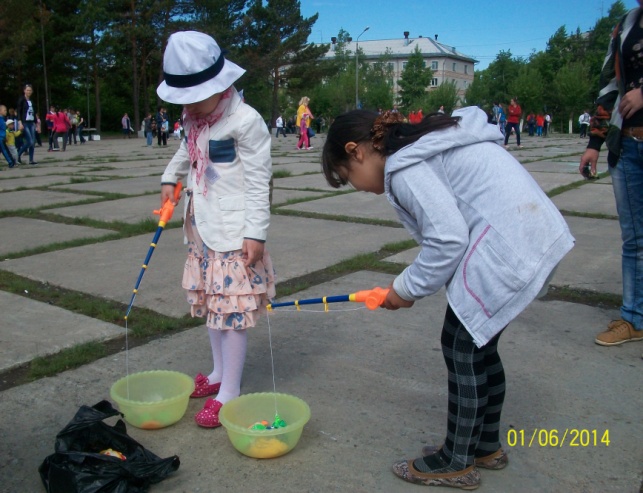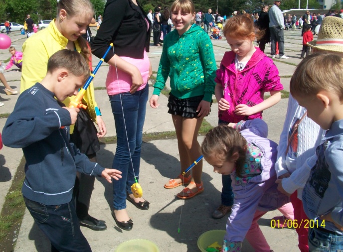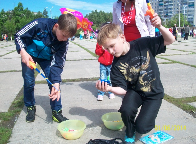 В ходе соревнований по ловле рыбы и забрасыванию колец на палки и мячиков в корзины лица ребят озаряли весёлые улыбки. Смех, азарт в глазах ребятишек, одобрительные возгласы поддержки со стороны родителей, которые болели за своих детей сильнее всех, раздавались со всех сторон. Было весело и шумно. А после каждого раунда участники получали сладкие призы. Нам очень понравилось общение с детьми нашего города, на улице вовсю светило летнее солнце и на лицах ребятишек светились свои маленькие солнышки.