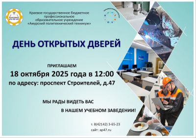 18 октября 2025 года Амурский политехнический техникум приглашает школьников и их родителей в гости!